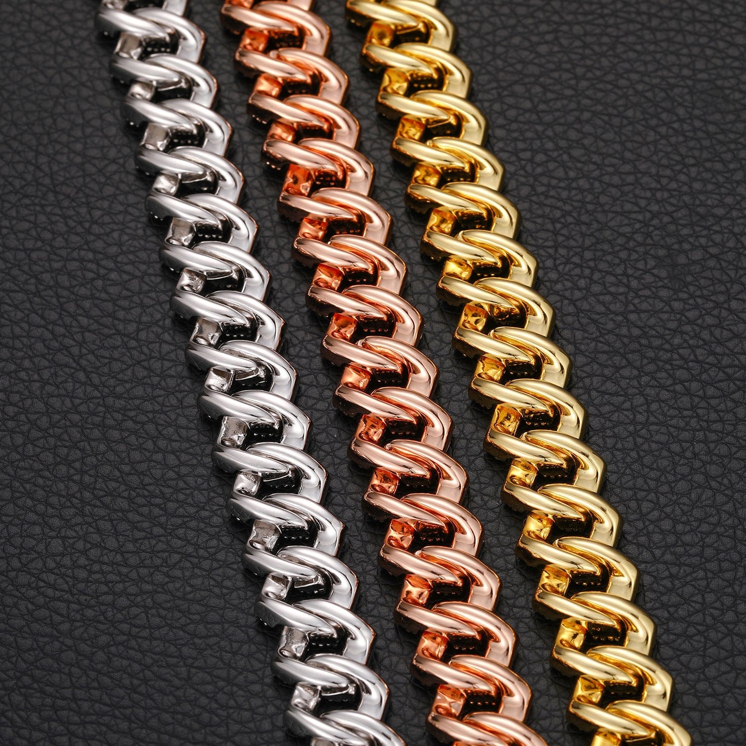 At 14MM, this chain sits in the perfect spot—substantial enough to stand out, yet sleek enough for daily wear. Available in silver, gold, and rose-gold tones, it’s a versatile statement piece that pairs effortlessly with streetwear, nightlife fits, or layered drip.
