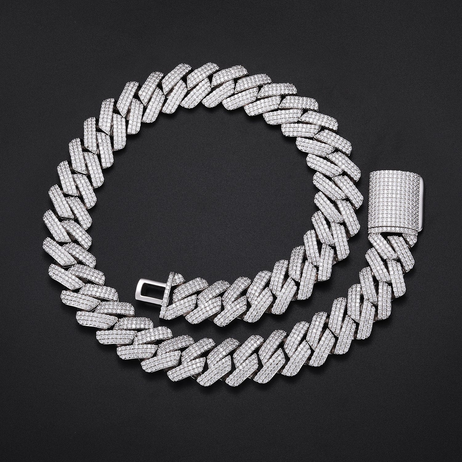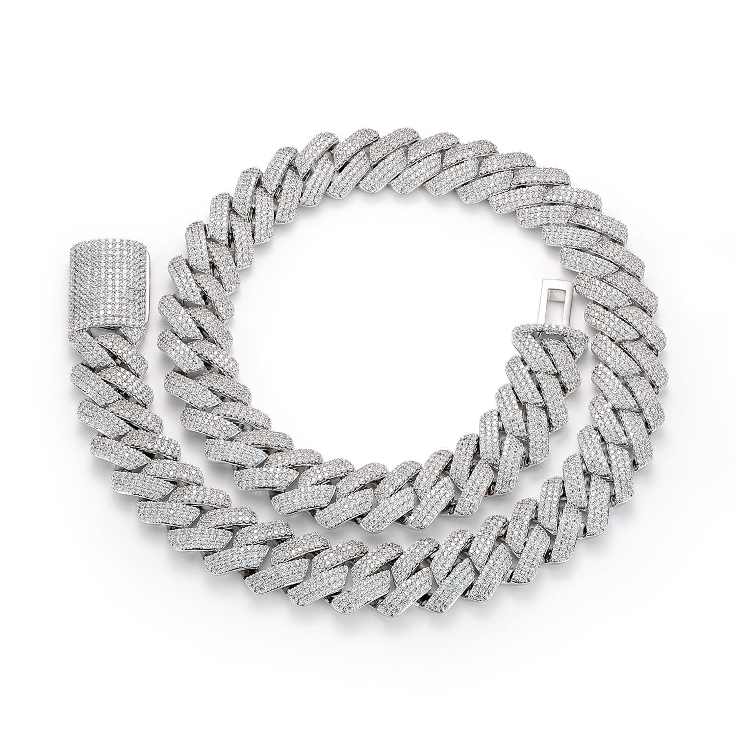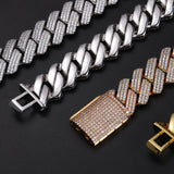 The flat Miami Cuban design adds a modern, sharp aesthetic, while the open-link structure enhances shine and flexibility, making it comfortable despite its solid weight. The fully iced clasp completes the design with a seamless finish, ensuring your piece looks flawless from end to end.